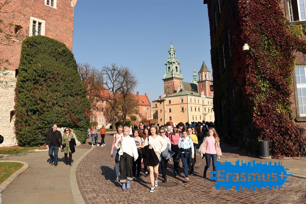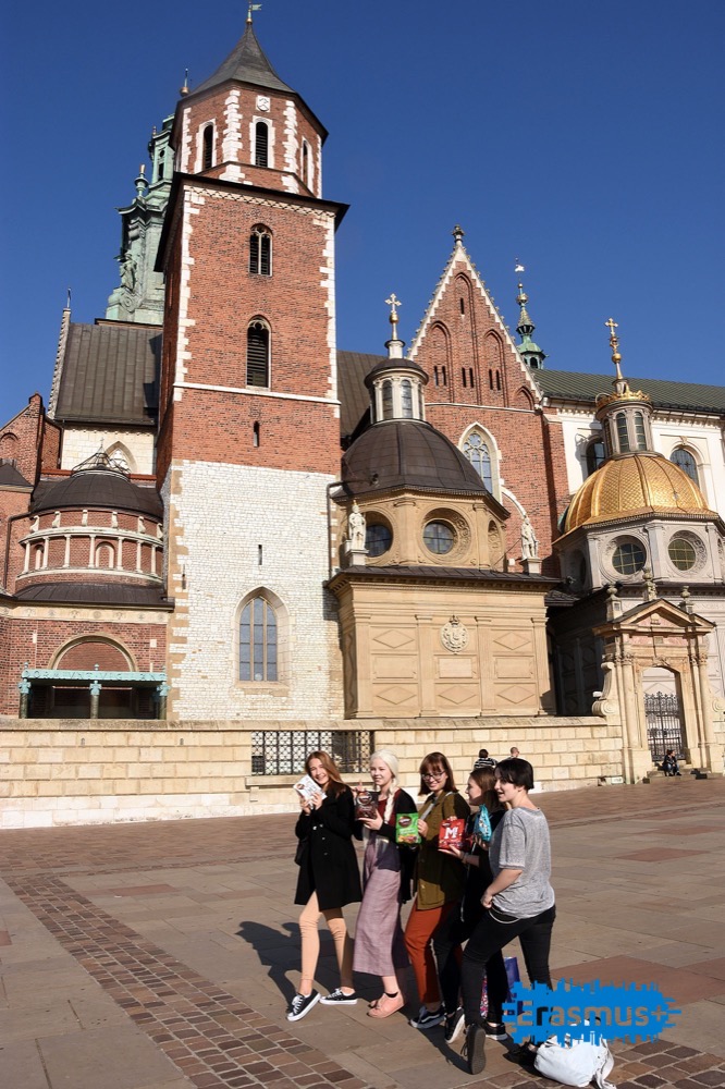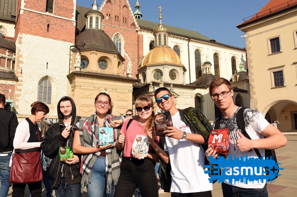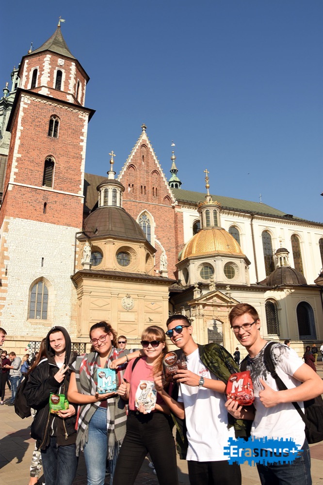 Piąty dzień z projektem rozpoczął się od wizyty na Zamku Królewskim na Wawelu. Nasi goście mieli okazję zobaczyć Katedrę, Kaplicę Zygmuntowską, Reprezentacyjne Komnaty, renesansowy dziedziniec zamku. Po zwiedzaniu czekała na nich słodka niespodzianka przygotowana przez naszych uczniów- słodycze od Wawelu na Wawelu.