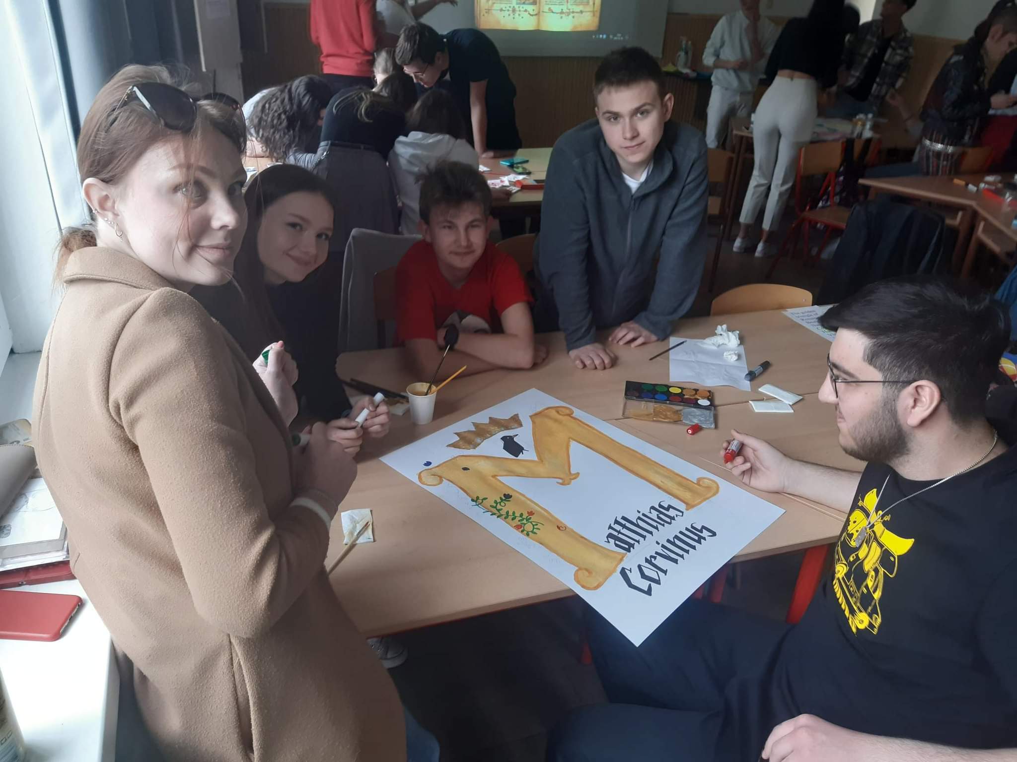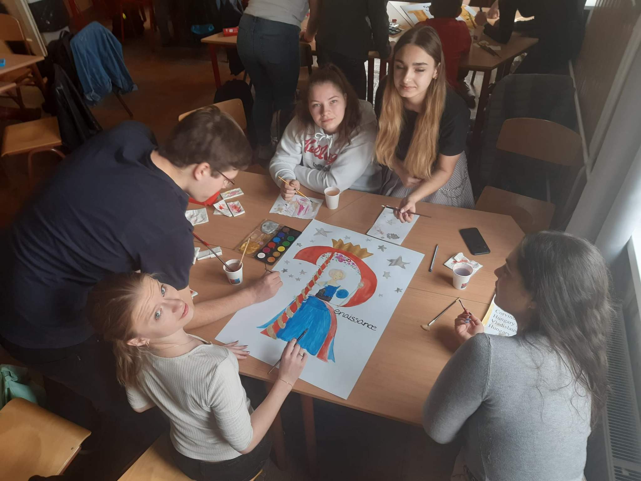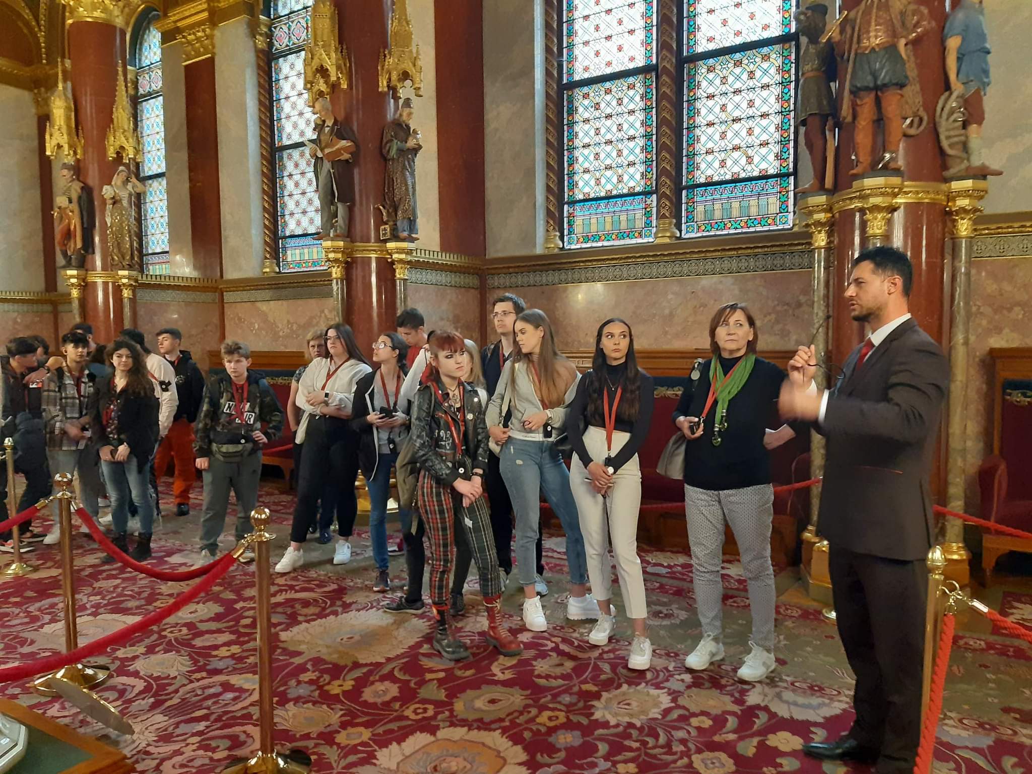 Wszyscy z dobrym humorem zebraliśmy się na zbiórkę po czym wyruszyliśmy komunikacją miejską do węgierskiej szkoły. Tam powitali nas uczniowie z pustymi kartkami i farbami. Jednak przed tym jak dostaliśmy informacje o zadaniu, które mieliśmy wykonać w grupach powiedzieli, że zrobimy Kahoota o tematyce dnia poprzedniego. Po jej skończeniu przeszliśmy do głównego zadania – uczniowie wyjaśnili nam na czym polega dzisiejsze wyzwanie. Rozdali nam po jednym słowie a my z wiedzą którą zyskaliśmy w bibliotece Széchényiego mieliśmy jak najpiękniej udekorować pierwszą literę. Kiedy czas naszej pracy dobiegł końca każda z grup powiesiła na tablicy swoje słowo i w połączeniu wyszło jedna zdanie „The Golden Trangel Of Reneissance Beatrice Of Naples Matthias Cornvinus Vladislaus II”. Po południu, zwiedzając parlament, dowiedzieliśmy się wielu ciekawych rzeczy takich, jak legenda o skrzywionym krzyżu na koronie królewskiej oraz zobaczyliśmy między innymi sale obrad oraz pięknie ozdobione sufity.