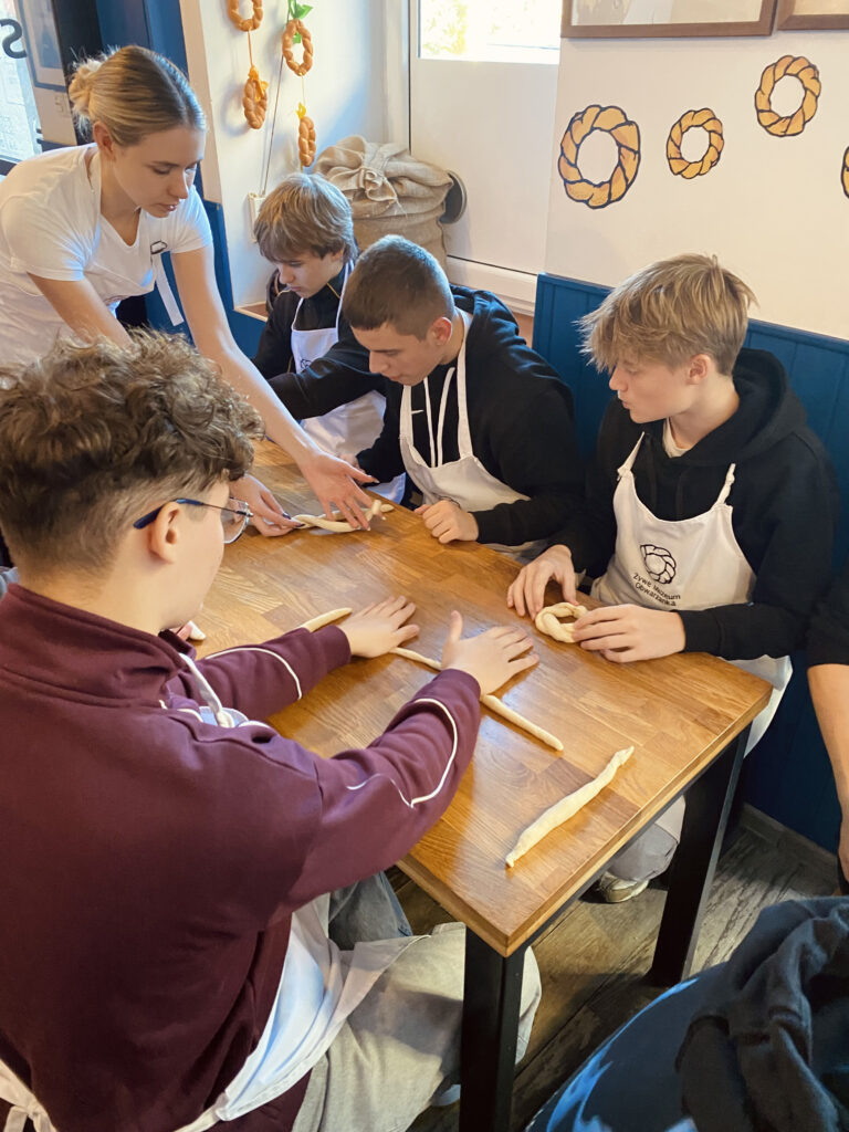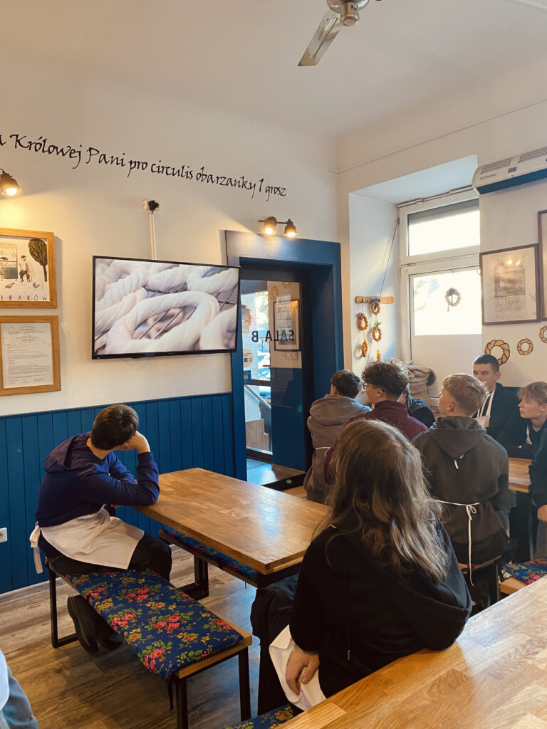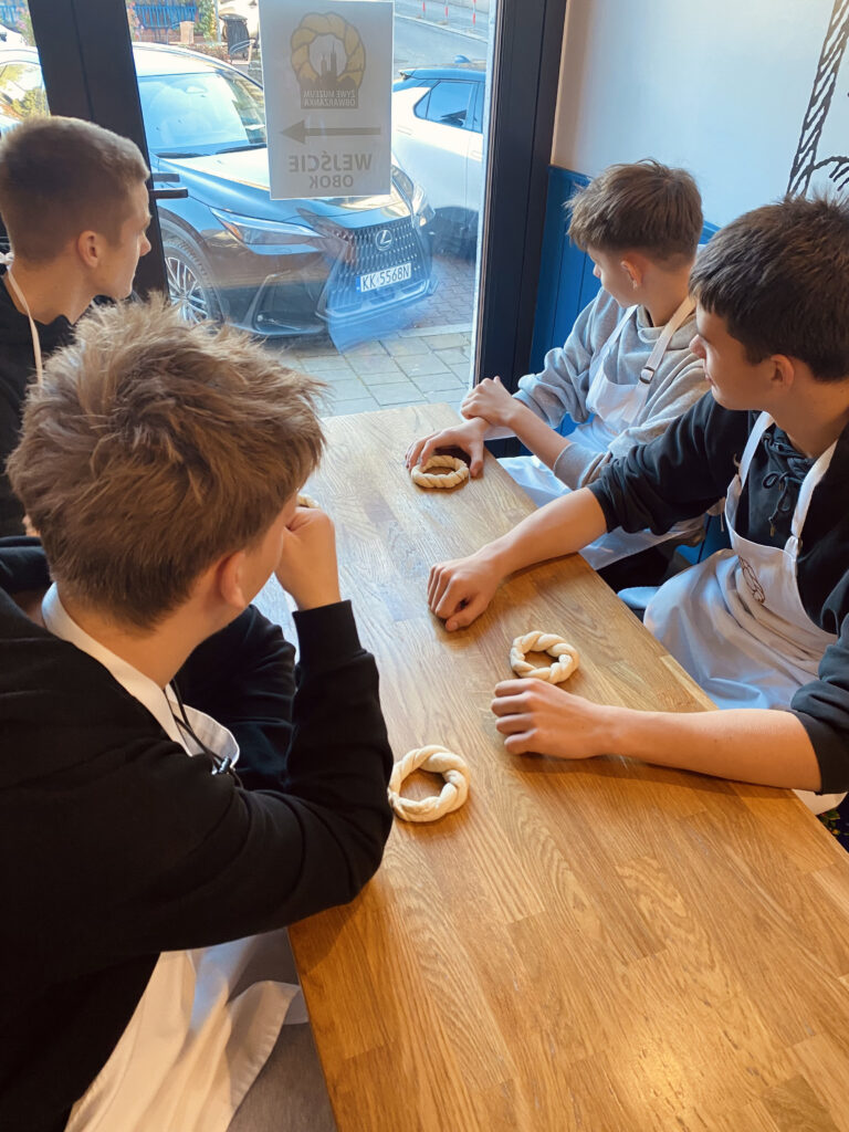 Kolejnym etapem wycieczki była wizyta w Muzeum Żywego Obwarzanka, gdzie młodzież poznała historię krakowskiego obwarzanka, jego skład i sposób przygotowania. Uczniowie wzięli udział w warsztatach praktycznych, podczas których własnoręcznie uformowali i upiekli tradycyjny obwarzanek. Na zakończenie każdy uczestnik otrzymał pamiątkowy dyplom oraz mógł zabrać swój wypiek do domu.