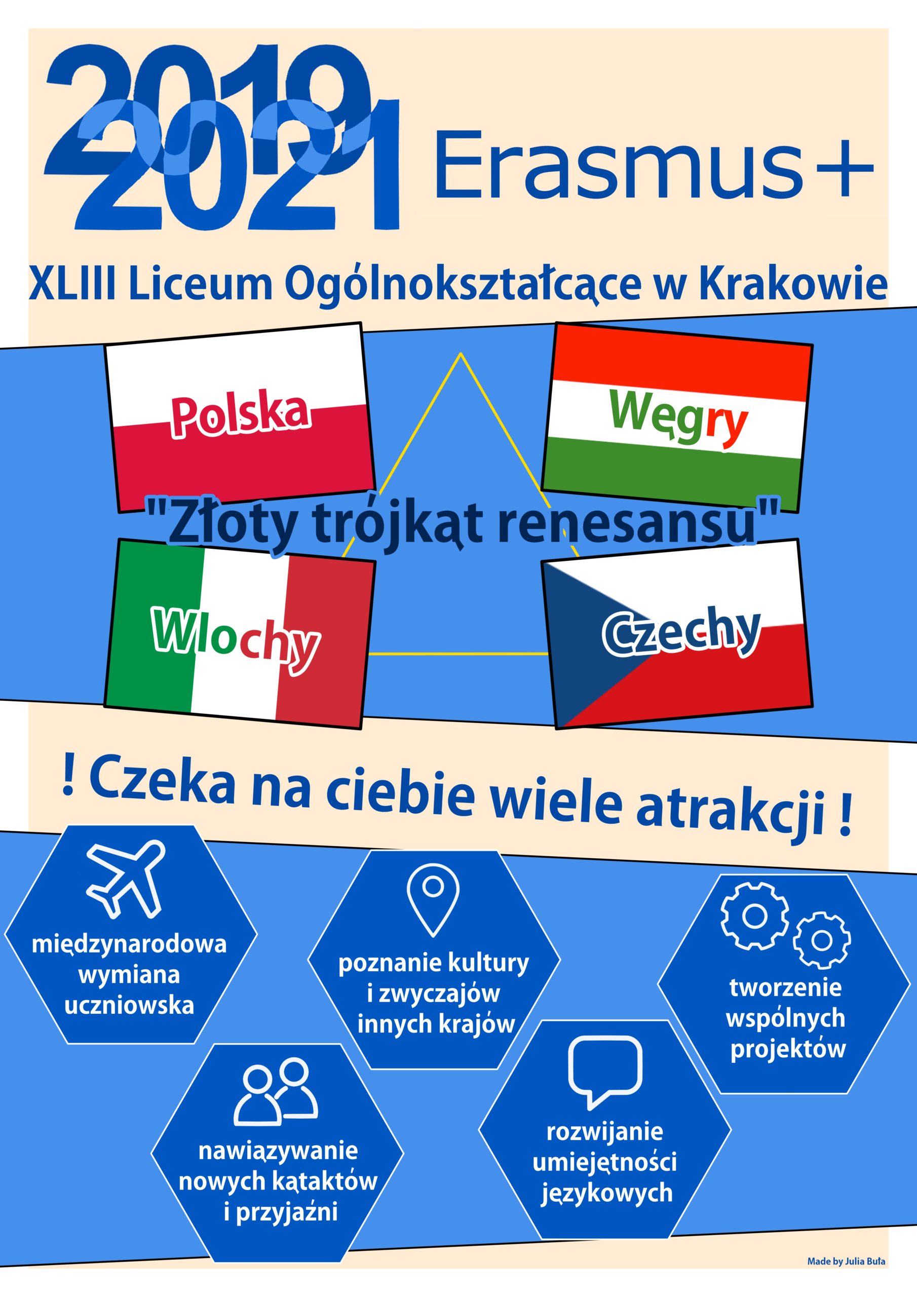 Na lata 2019 – 2021 w naszym liceum zaplanowany został międzynarodowy projekt finansowany ze środków Unii Europejskiej. W projekcie biorą udział uczniowie z Polski, Czech, Węgier i Włoch. Hasło projektu brzmi „Złoty trójkąt renesansu – Beatrycze Aragońska, Władysław Jagiellończyk, Maciej Korwin.”